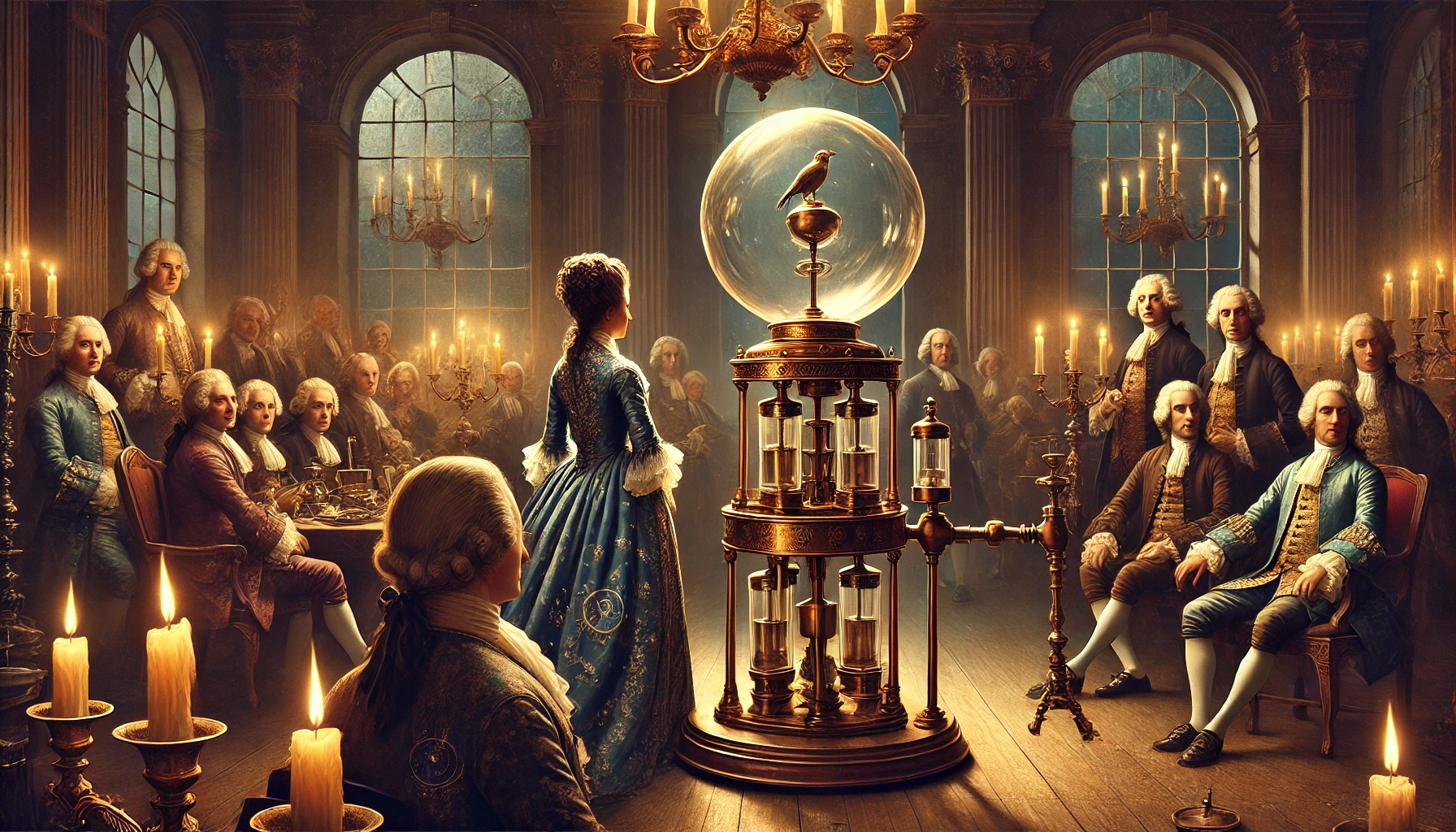 Boyle, con voz pausada y cierto tono didáctico, explica el procedimiento, mientras introduce en la esfera un gorrión, ignorante de su triste destino. Margaret no pierde detalle, inmóvil. Las luces de las velas se reflejan en sus ojos, en apariencia más pendientes de los gestos de los hombres que de la máquina.