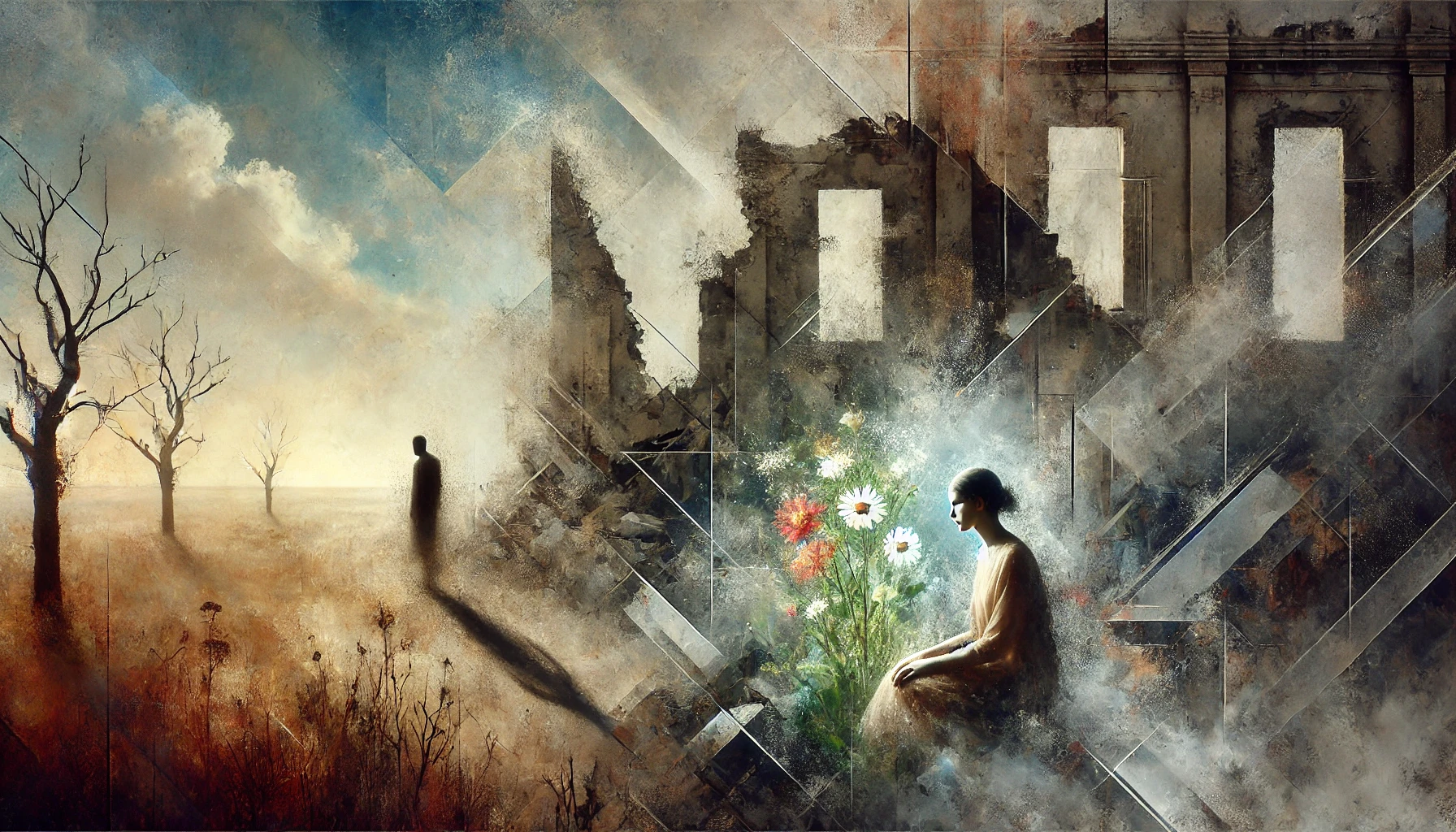 Se acababan de encontrar, por primera vez desde el final de la guerra, en un rincón del pueblo que recordaban distinto, más vivo y entero, de cuando la familia de él cosechaba los campos de la de ella, solo dos años antes. Álvaro caminaba con pasos inseguros; ella, tranquila, recogía algunas flores silvestres que habían brotado entre las ruinas. En ese momento, levantó la vista para responderle, sonriendo con un punto de nostalgia.